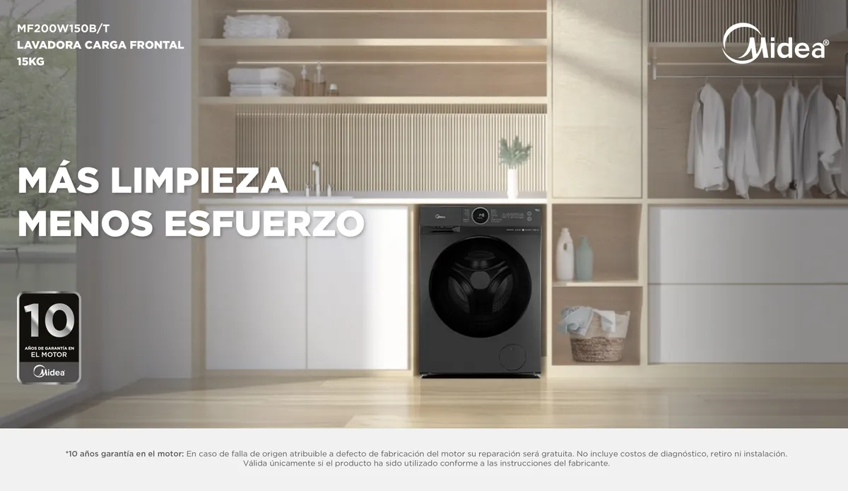 Con la lavadora automática carga frontal de Midea MF200W150B/T 15 KG dejarás todas tus prendas como nuevas. Con Health Guard que ayuda a sanitizar la ropa, eliminando bacterias comunes activando su programa de secado a altas temperaturas. Sistema Inverter Quattro con tecnología que ayuda a reducir el consumo de energía hasta en un 70%, además de disminuir el ruido y la vibración. También cuenta con función de prelavado con 1 toque, la cual lavará tu ropa suavemente antes del ciclo de lavado principal, logrando mejor desempeño de lavado. Wifi / Control Remoto, control y monitoreo inteligente de tu lavadora, en cualquier momento y lugar. Función turbo de lavado rápido, que acorta el tiempo de lavado al acelerar la rotación del tambor, logrando un ahorro de hasta un 40% de tiempo del programa de lavado seleccionado. Programa de lavado de Antialergias y Steam Care incorporado.