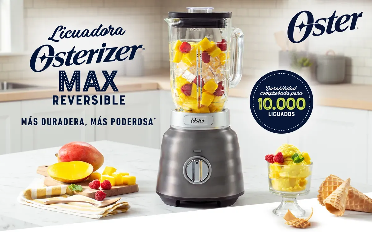 Inspirada en nuestra clásica licuadora Oster®, nace la nueva licuadora Osterizer Max Reversible que es más duradera y poderosa*, tiene un motor con 1500 W de potencia** con dos velocidades más pulso reversible que le permite girar las cuchillas en ambas direcciones procesando completamente todos los ingredientes. Su acople 100% metálico 10 veces más fuerte*** y acabado metálico de alta calidad en la base es más elegante para un consumidor exigente como tú, también posee una luz de encendido LED. El vaso de vidrio resistente a ingredientes hirviendo**** tiene 1,75 litros de capacidad y una revolucionaria cuchilla trituradora de hielo más grande que las regulares*****. Es una licuadora que te permite preparar día a día los más ricos platos, jugos y licuados con ingredientes duros o difíciles de mezclar. En ella puedes mezclar desde sopas y batidos, hasta jugos, muffins, salsas, sazonadores, tortas y muchas otras recetas. Lo que te provoque, lo puedes hacer de manera sencilla, fácil y agradable, obteniendo resultados profesionales. Es la licuadora que te da el poder para crear todo lo que imaginas y luego la podrás limpiar fácilmente gracias a que todas sus piezas son desmontables.