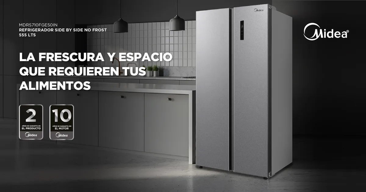 Con el refrigerador Side by Side Midea MDRS710FGE50IN No Frost 555 litros tendrás más espacio para conservar y manipular tus alimentos. Con sistema Multi Air Flow que conserva de manera homogénea tus alimentos gracias a flujos de aire en múltiples niveles; Double Box para una mejor mantención y distribución de frutas y verduras; y Smart Function con las opciones de modo vacaciones y bloqueo para niños que facilitarán tu uso.