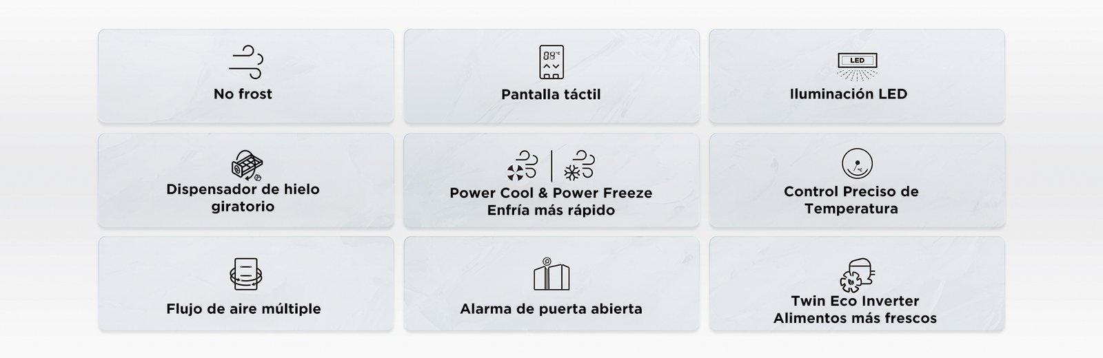 Mantén una temperatura uniforme en todo el refrigerador y olvídate de la escarcha en el congelador. Disfruta una conservación óptima, ahorro de energía y mayor comodidad: sin descongelación manual, sin alimentos pegados y con etiquetas siempre legibles.